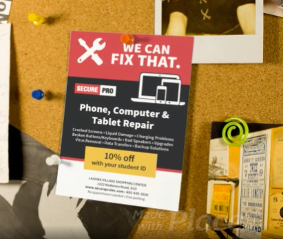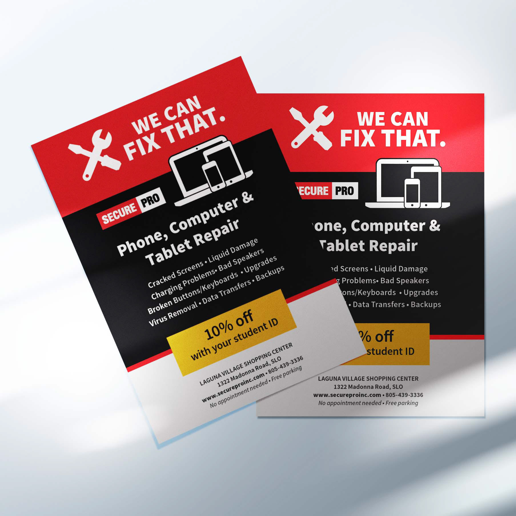 We wanted to make sure our repair services stayed front and center during this time, so I put together the "We Can Fix That" campaign. We've maintained a steady flow of traffic to our Laguna Village Shopping Center retail location while expanding our local services to include security, video surveillance, access control, VOIP and Managed IT services.